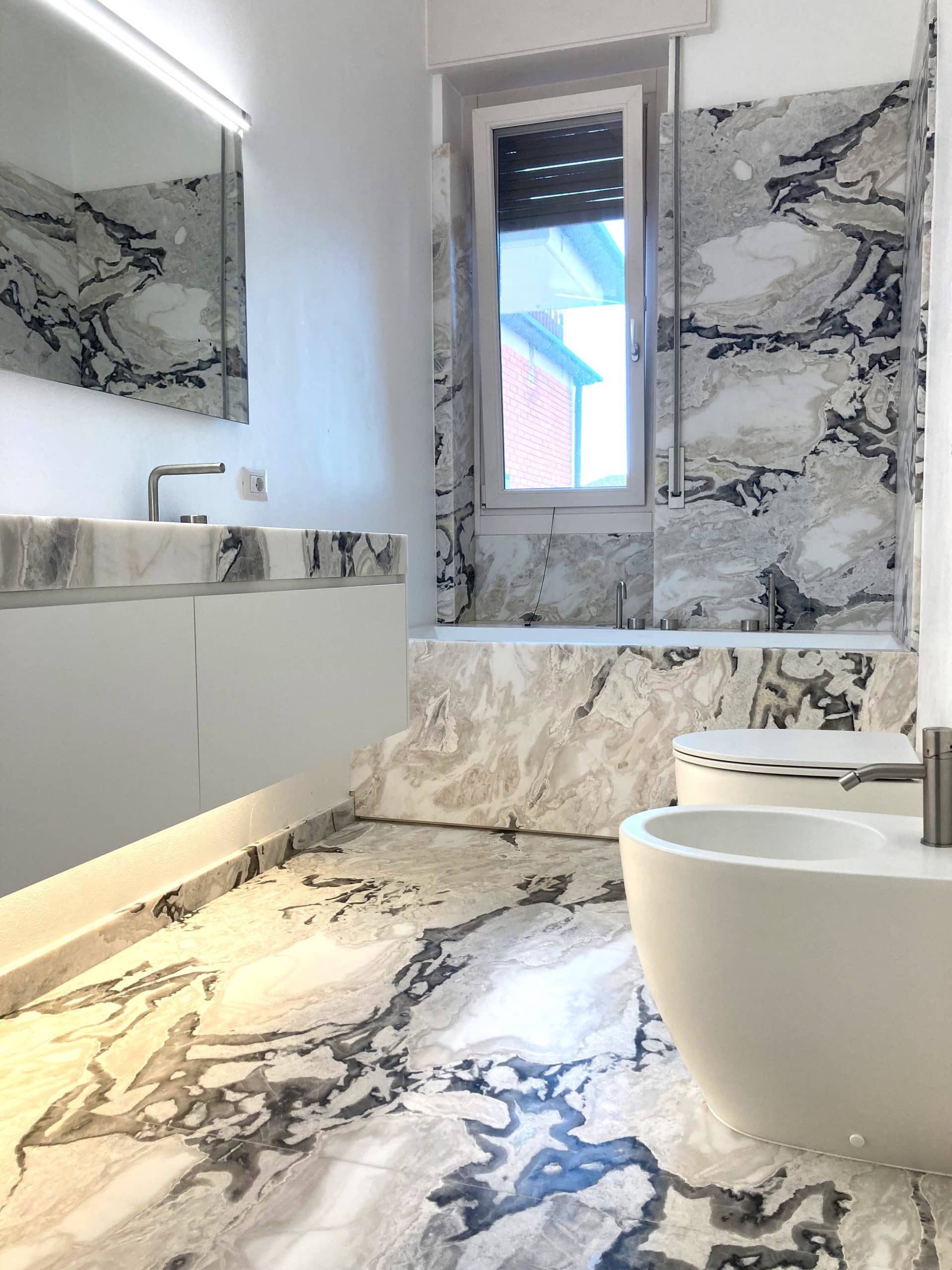 Il bagno può anche essere rivestito completamente in pietra. Un esempio potrebbe essere quello in cui il marmo riveste pareti e pavimento e viene usato anche come materiale per i sanitari. L’obiettivo è quello di avere una continuità del materiale utilizzato che richiama ad una piccola Spa.